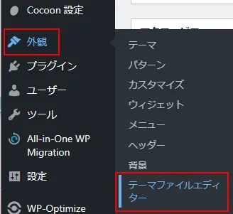 WordPress管理メニューの「外観」→「テーマファイルエディタ―」をクリック。