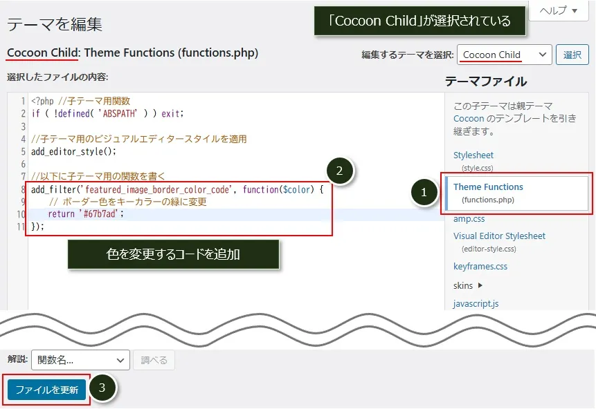 子テーマが選択されていることを確認し、「Theme Functions(functtions.php)」(①)をクリックし、色を変更するコードを追加(②)したら、画面下にある「ファイルを更新」(③)をクリック。