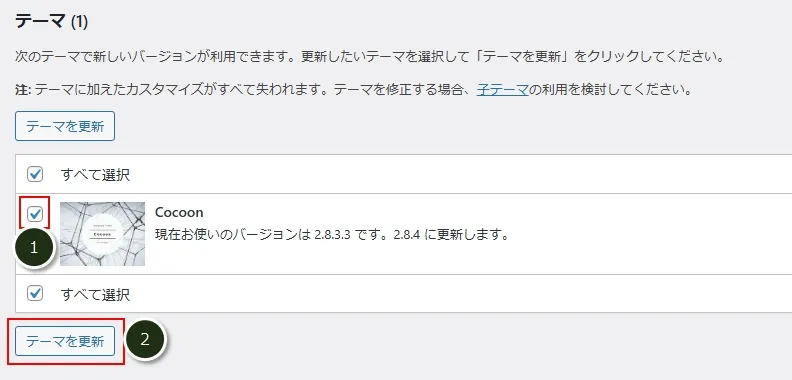 Cocoonにチェック(①)をつけて、「テーマを更新」(②)をクリックすると、最新版にバージョンアップされます。