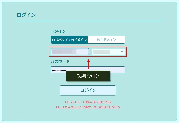 ロリポップの申込みの「アカウント情報入力」のステップで、①初期ドメイン名、③パスワードを入力しています。(②は自動割り当て)