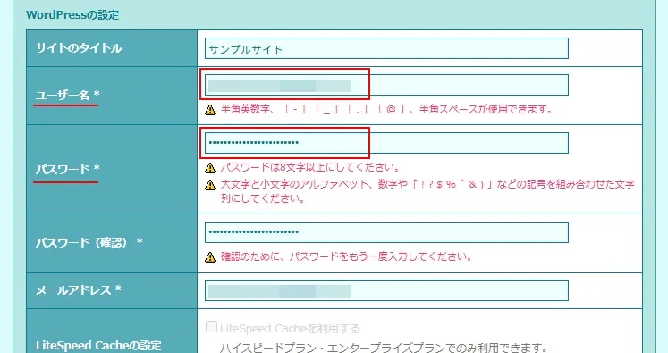 | ②ユーザー名 | WordPressにログインする時のユーザー名です。 ユーザー名はメモなどをして、絶対に忘れないようにしてください! ユーザー名を忘れてしまうと、WordPresにログインできなくなります。 |