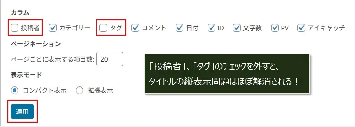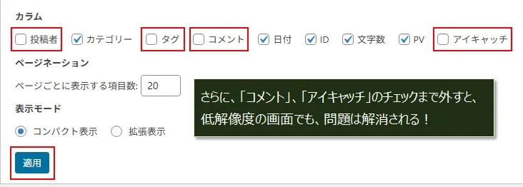 「投稿者」、「タグ」のチェックを外して「適用」をクリック。