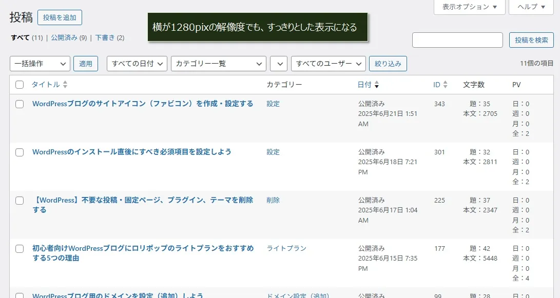 結局のところ、標準状態で投稿一覧の列が多すぎるのが原因なので、タイトルの列幅が狭くなって縦に表示されてしまうんです。