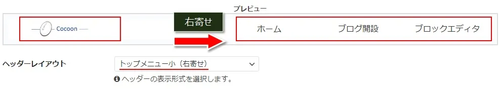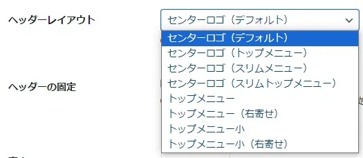 ヘッダーレイアウトには「センターロゴ(デフォルト)」~「トップメニュー小(右寄せ)」の8通りあるので、好きなレイアウトを設定できます。