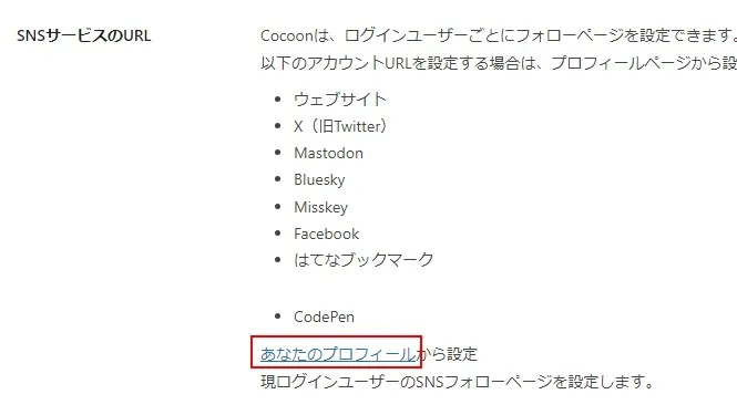 「SNSサービスのURL」にある、「あなたのプロフィール」をクリック。