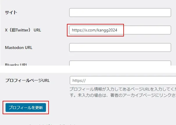 「プロフィール」画面でSNSアカウントのURLを入力して、「プロフィールを更新」をクリック。