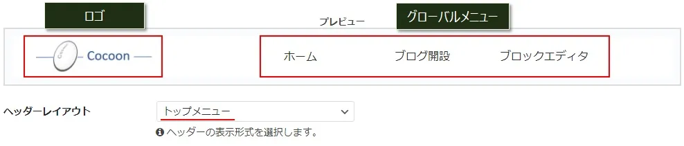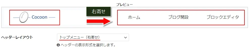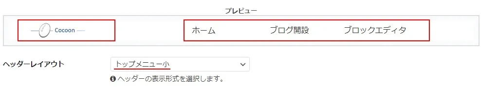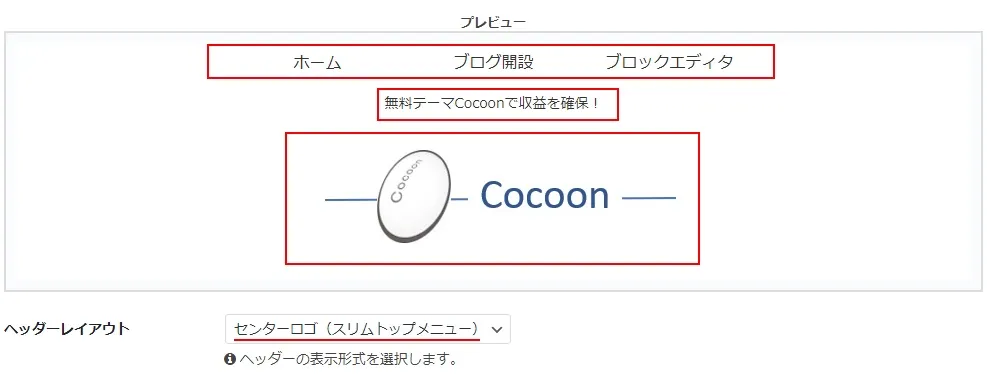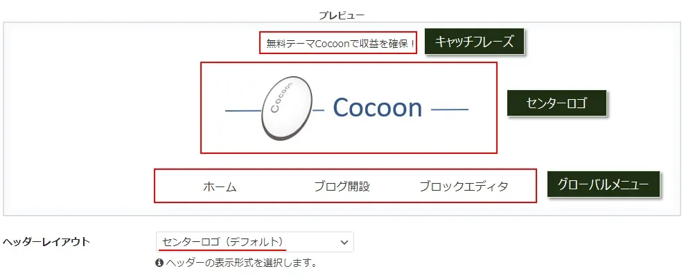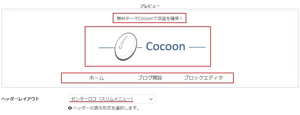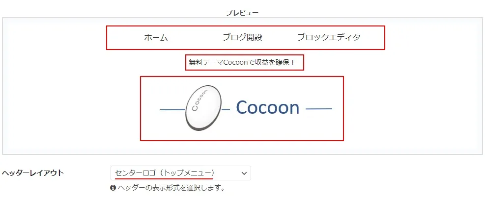 下の画像は「センターロゴ(デフォルト)」を選択した時のヘッダーで、既にヘッダーロゴ画像にCocoonの画像を設定している状態です。