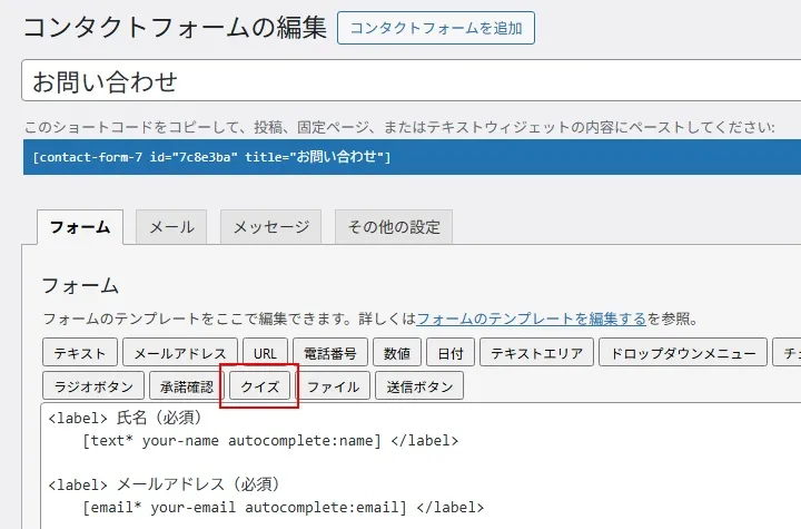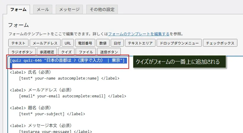 すると、クイズのタグがフォームの一番上に追加されます。