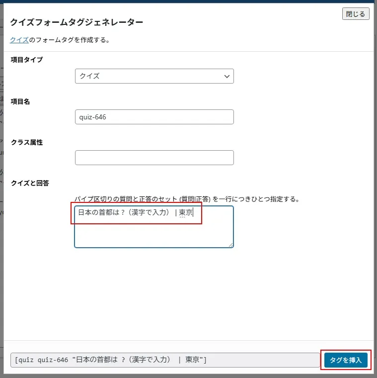 クイズの画面が開くので、赤枠の部分にクイズとその答えを入力して、「タグを挿入」をクリック。