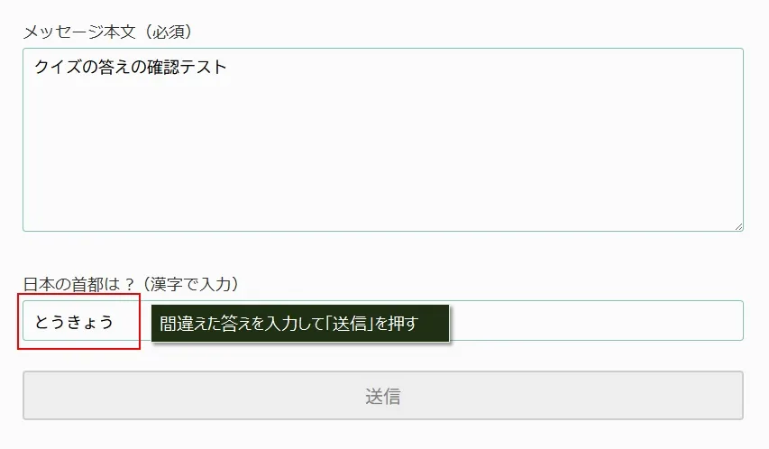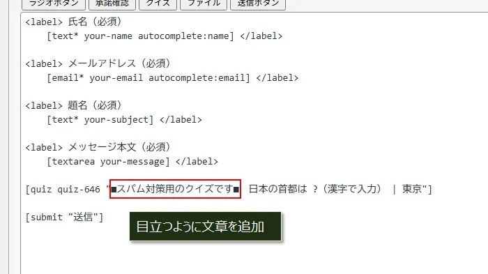 さらに、クイズに「スパム対策」のためのクイズであることがわかるように、文章を追加します。